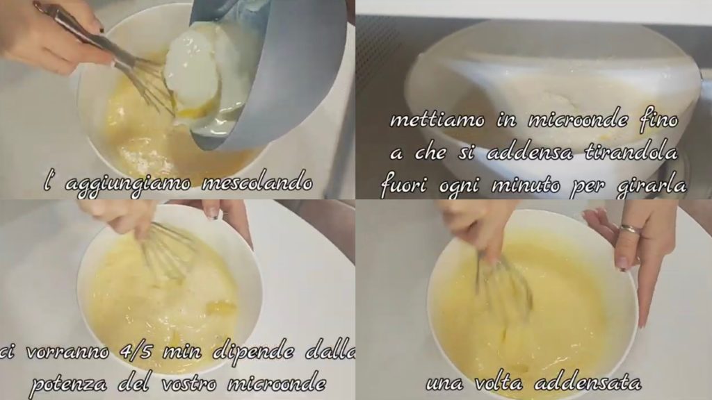 dann fügen wir sie unter Rühren hinzu. Wir stellen es in die Mikrowelle, bis es eindickt, nehmen es jede Minute heraus, um es umzurühren. Es dauert 4/5 Minuten, je nach Leistung Ihrer Mikrowelle. Sobald es eingedickt ist