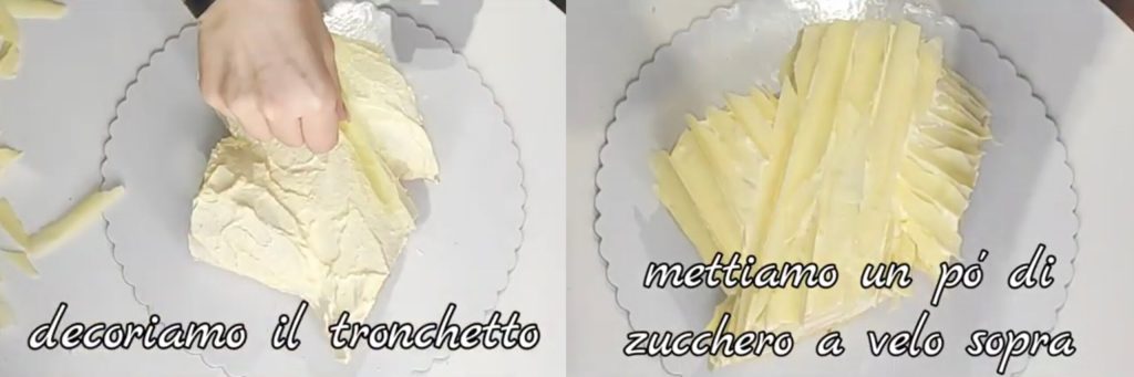 Wir dekorieren den Baumstamm mit den erhaltenen Stücken. Wir bestäuben mit etwas Puderzucker.