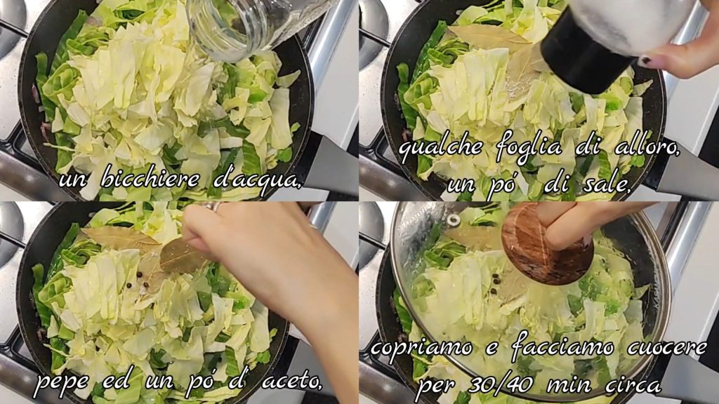 Wir fügen ein Glas Wasser, ein paar Lorbeerblätter, etwas Salz, Pfeffer und etwas Essig hinzu.