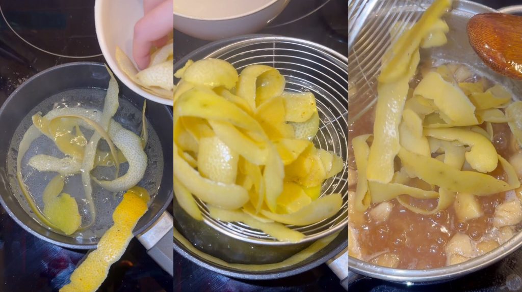 Blanchiere die Schalen 3–4 Minuten in Wasser. Siebe sie ab und wiederhole den Vorgang 2–3 Mal, um die Bitterkeit zu beseitigen. Füge die blanchierten Schalen hinzu.
