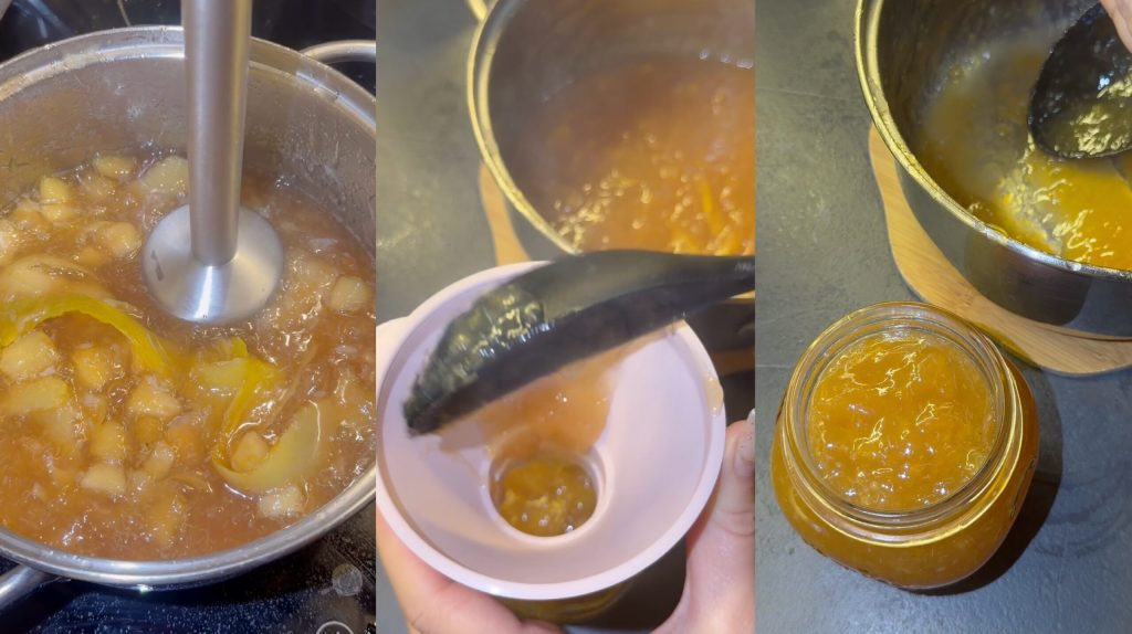 Gib die mazerierten Zitronen in den Topf. Füge den geschälten und in Stücke geschnittenen Apfel hinzu (hilft beim natürlichen Eindicken). Stelle es auf den Herd und koche es unter gelegentlichem Rühren. Füge Vanille, Ingwer oder Gewürze deiner Wahl hinzu.