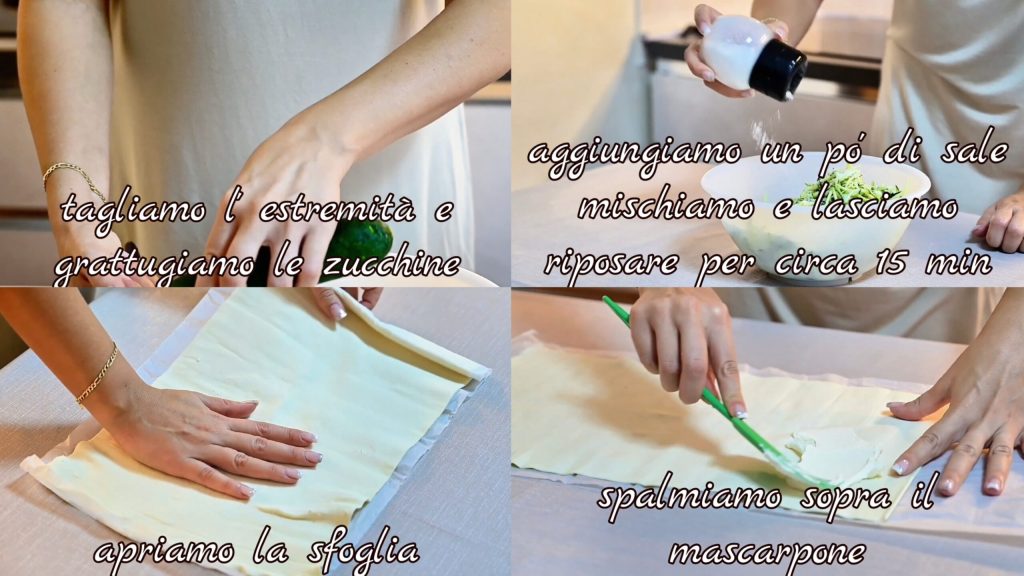 Zuerst müssen wir die Enden der Zucchini waschen und abschneiden, dann reiben wir sie. Wir fügen etwas Salz hinzu, mischen und lassen es für ca. 15 Min. ruhen. Den Blätterteig öffnen und den Mascarpone darauf verteilen.