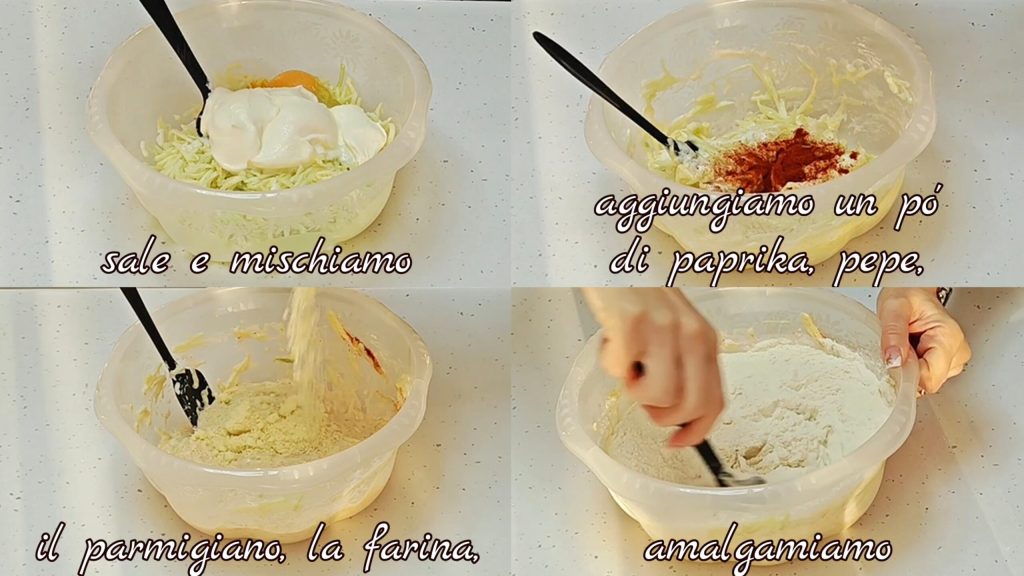 Fügen Sie etwas Salz hinzu und mischen Sie es. Wir geben etwas Paprika, Pfeffer, den Parmesan, das Mehl hinzu und mischen es.