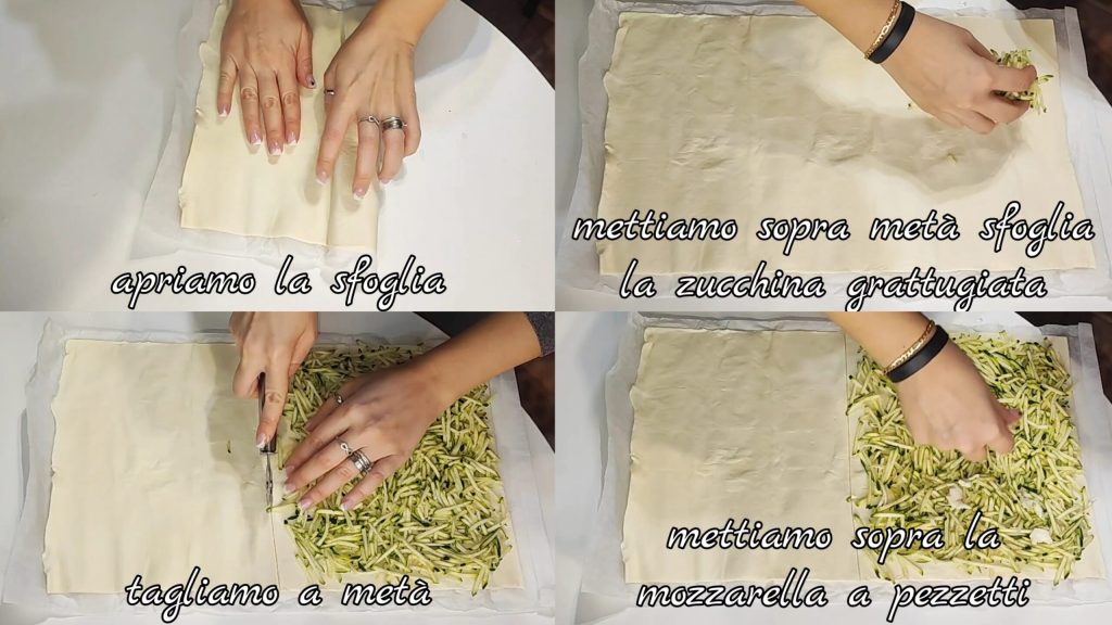 Wir öffnen den Blätterteig und legen die geriebene Zucchini (natürlich vorher gereinigt und gewaschen) auf die Hälfte. Wir schneiden den Blätterteig in der Mitte durch. Wir legen die Mozzarella-Stücke auf den Teil, auf dem wir die Zucchini platziert haben.