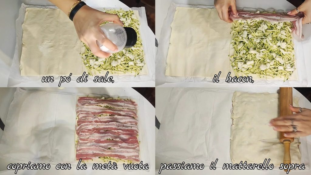 Wir fügen etwas Salz und die Speckscheiben hinzu. Wir bedecken mit der leeren Hälfte und rollen darüber mit einem Nudelholz.