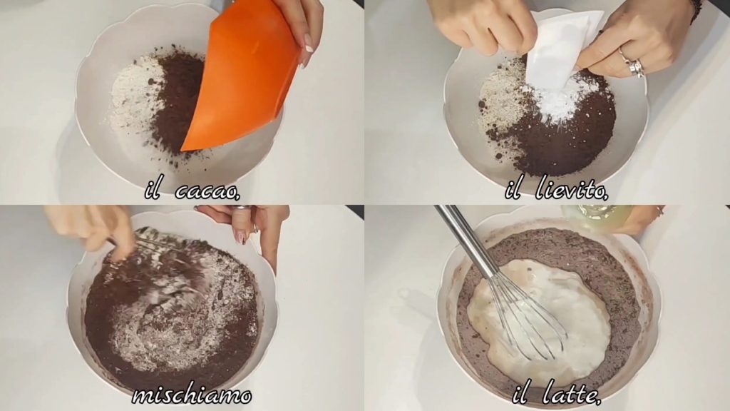 In einer Schüssel Mehl, Kakao, Zucker, Backpulver vermischen. Milch hinzufügen.