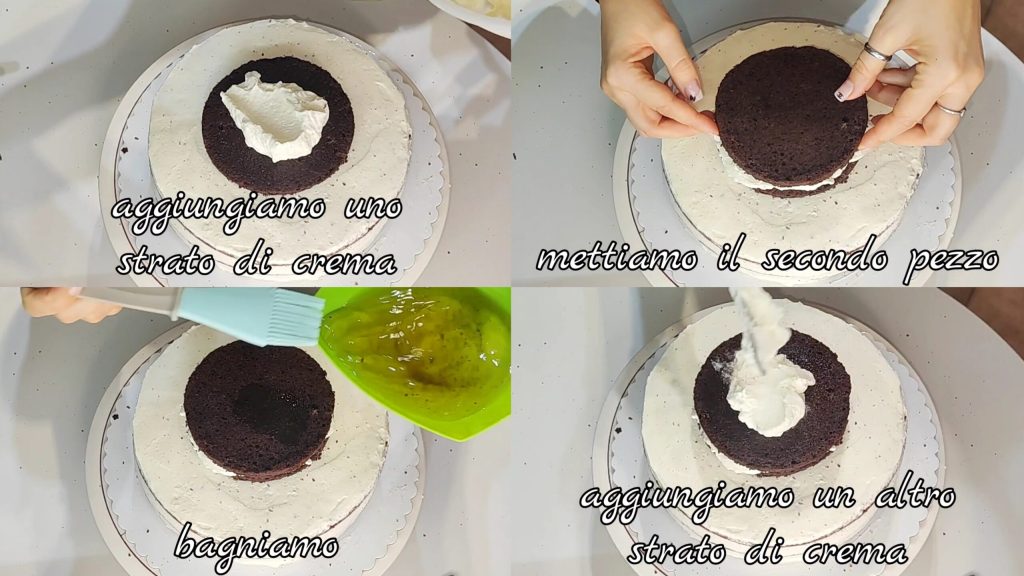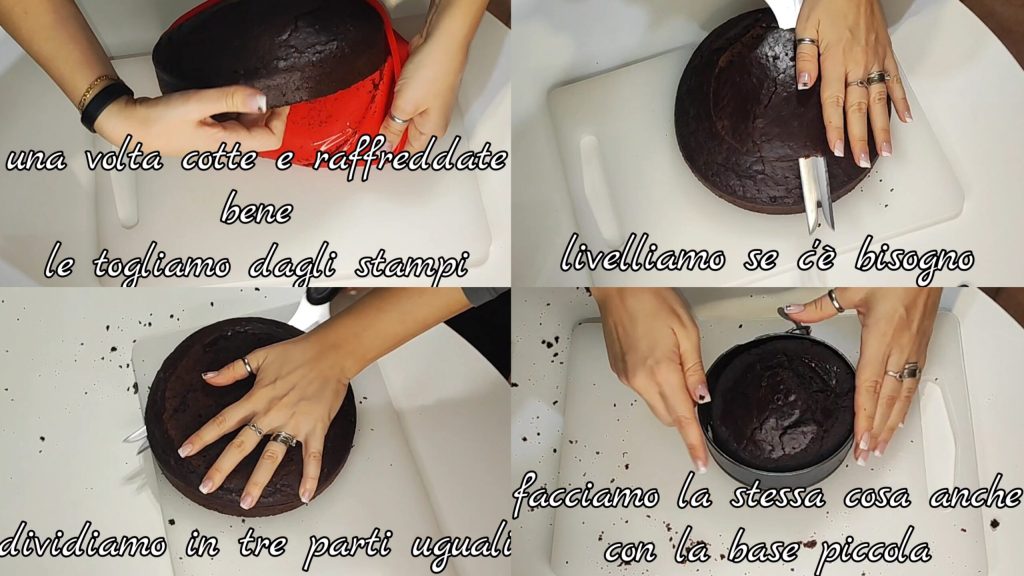 Sobald sie gebacken und abgekühlt sind, aus den Formen nehmen, glätten, falls nötig die Kuppel abschneiden und dann jeden in drei gleiche Scheiben teilen.