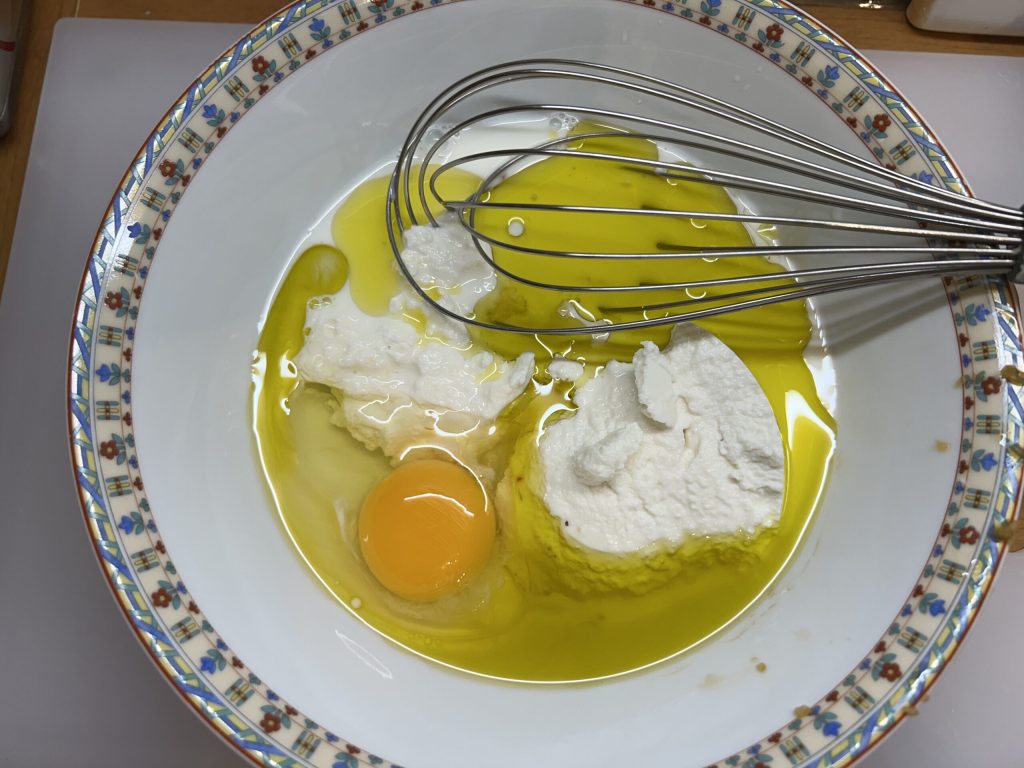 • In einer anderen Schüssel mit einem Schneebesen Ricotta mit dem ganzen Ei, der Milch, dem Olivenöl und dem Honig mischen.