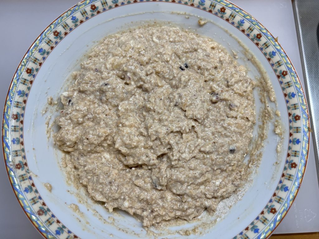 • In einer Schüssel alle trockenen Zutaten mischen: Mehl, gehackte Trockenfrüchte, Zimt und Backpulver
