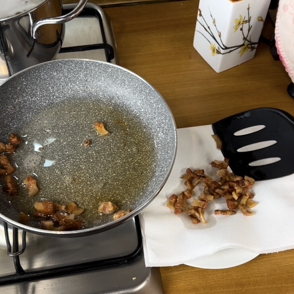 • Den Guanciale in einer antihaftbeschichteten Pfanne ohne zusätzliches Fett anbraten, bis er goldbraun und knusprig ist