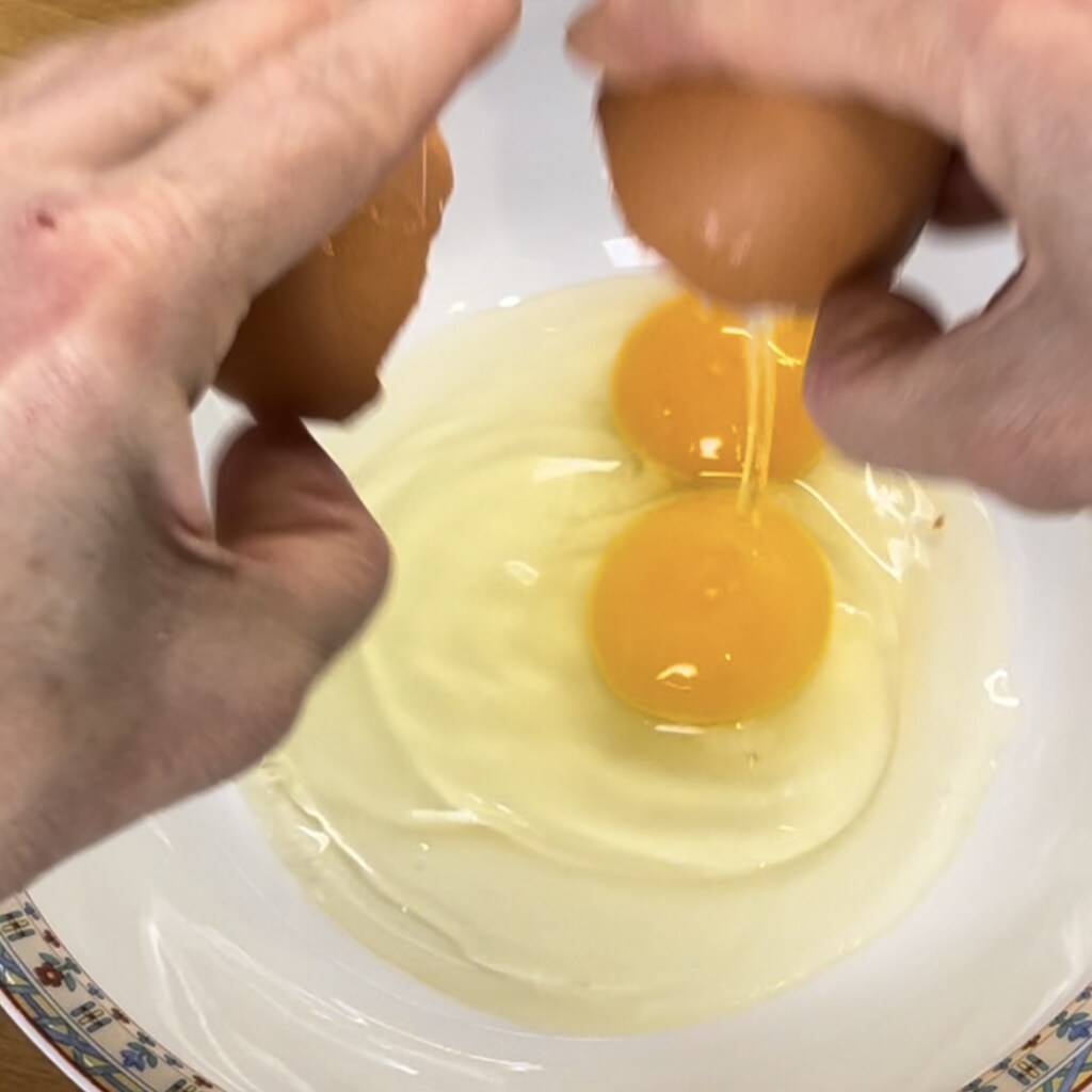 • Die Pasta al dente abgießen und in der Schüssel mit den verquirlten Eiern mischen