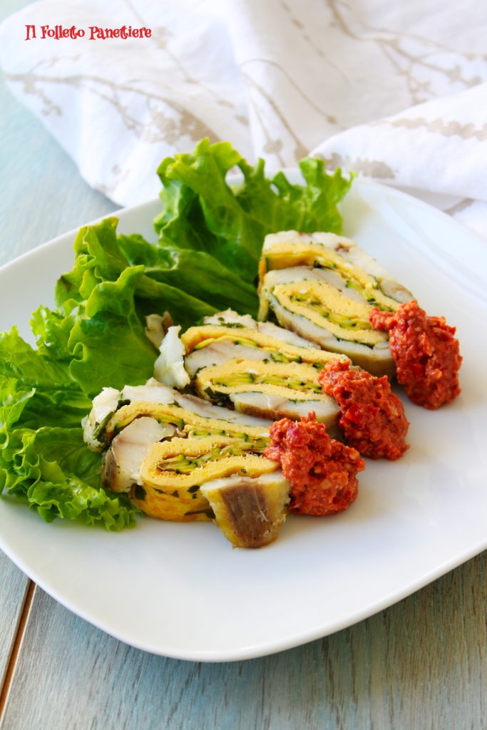 Der Seeteufel hat nämlich festes, zartes Fleisch und den Vorteil, nur einen großen, leicht zu entfernenden Mittelgräten zu haben. Deshalb eignet er sich hervorragend für die Zubereitung dieser Rolle, die mit einem Omelett und gegrillten Zucchini gefüllt wird.
