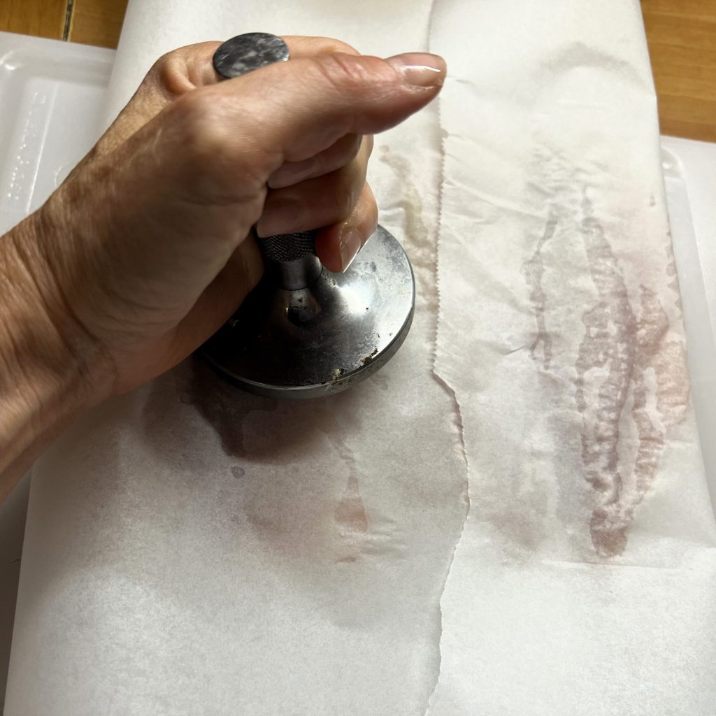 Bedecken Sie sie mit einem zweiten Blatt Backpapier und klopfen Sie sie vorsichtig mit einem Fleischklopfer, um den Fisch leicht zu plätten