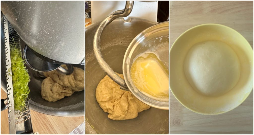 Füge die abgeriebene Zitronenschale hinzu, starte die Maschine und gib die weiche Butter nach und nach hinzu, während die Maschine arbeitet. Nimm den Teig heraus, lege ihn in eine Schüssel und lasse ihn 1 Stunde ruhen.