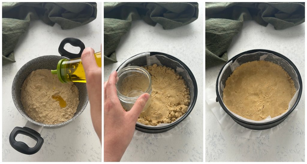 Gib das Taralli-Pulver in einen Behälter, füge das Öl langsam hinzu und mische es, bis du einen formbaren Teig erhältst. Lege eine Springform mit einem Durchmesser von 20 cm mit Backpapier aus, gib die Bodenmischung hinein, komprimiere und glätte sie mit der Rückseite eines Löffels oder, noch besser, dem Boden eines Glases. Lasse den Boden 30 Minuten im Kühlschrank ruhen.