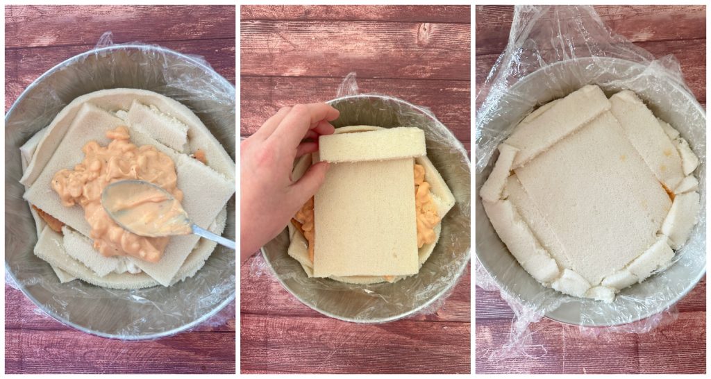 Eine 22 cm Durchmesser Schüssel mit Frischhaltefolie auslegen, das Sandwichbrot mit einem Nudelholz ausrollen und den Boden und die Seiten der Schüssel auslegen.