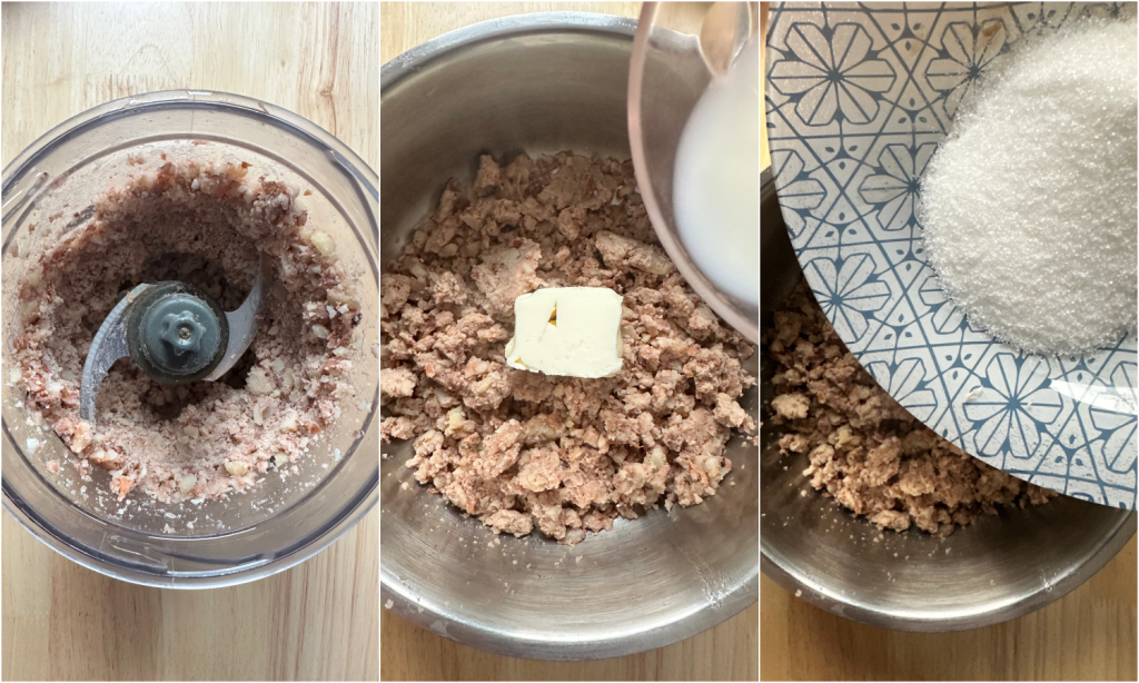 Gib alles in einen Mixer und püriere, bis eine grobe Masse entsteht. Übertrage die pürierten Kastanien in einen Topf, füge Butter, Milch und Zucker hinzu. Koche 5 Minuten lang bei hoher Hitze, bis sich der Zucker aufgelöst hat.