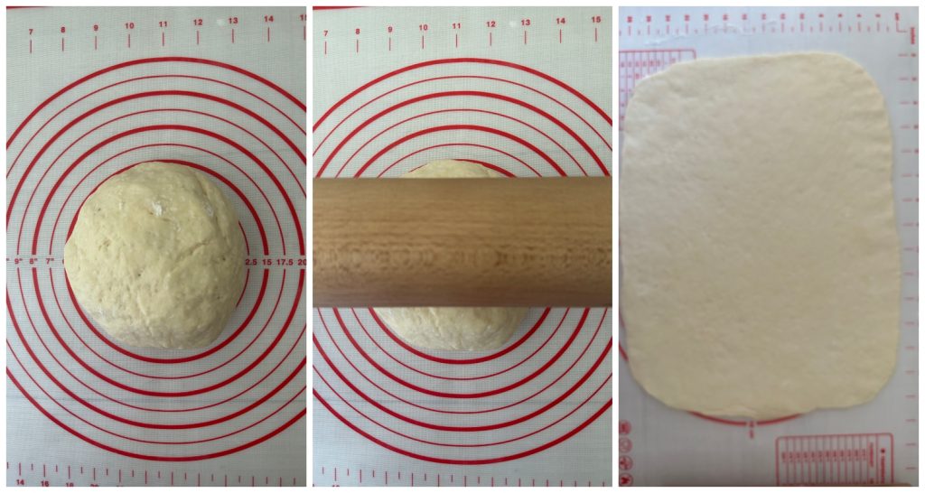 Teile den Teig in zwei gleich schwere Stücke, rolle jedes Stück mit einem Nudelholz aus, bis ein Rechteck von 20×30 cm entsteht.