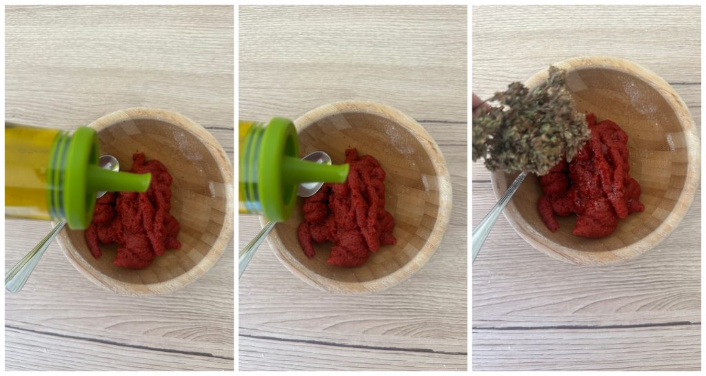 Gib das Tomatenmark in eine Schüssel, füge das Olivenöl und den Oregano hinzu, schmecke mit Salz ab und mische, um die Zutaten zu verbinden.