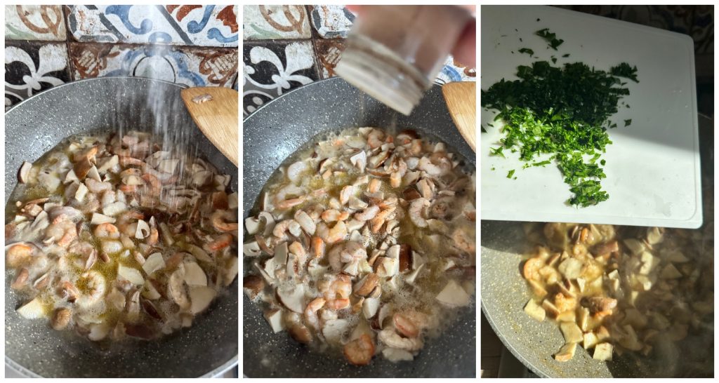 Würze mit Salz und Pfeffer. Lasse 15 Minuten kochen, bei Bedarf Wasser hinzufügen, um die Kochzeit zu verlängern. Am Ende der Garzeit auch die gehackte Petersilie hinzufügen. Koche die Pasta in reichlich gesalzenem kochendem Wasser, gieße sie al dente ab und gib sie in die Pfanne. Schwenke sie einige Minuten und richte sie an. Mit gehackter Petersilie bestreuen und deine Pasta mit Garnelen und Steinpilzen servieren!