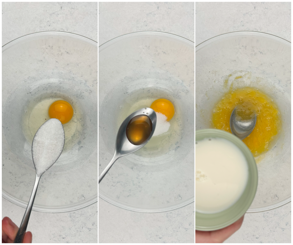 Um die Schokoladen-Chiacchiere im Heißluftfritteuse zuzubereiten, schlage zuerst das Ei in eine Schüssel, füge Zucker, Vanilleextrakt hinzu und mische schnell. Füge dann auch die Milch hinzu.