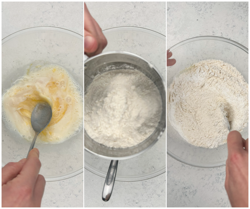 Mische erneut. Füge nach und nach das gesiebte Mehl und das Backpulver für Heißluftfritteuse hinzu. Knete zuerst mit einem Löffel.