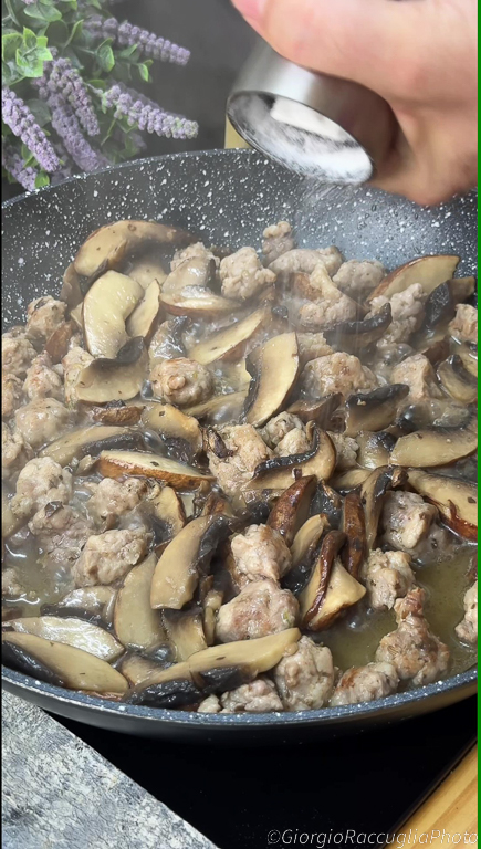 • In der Zwischenzeit die Pasta al dente kochen und abgießen. Mische sie mit der Wurst-Pilz-Sauce,