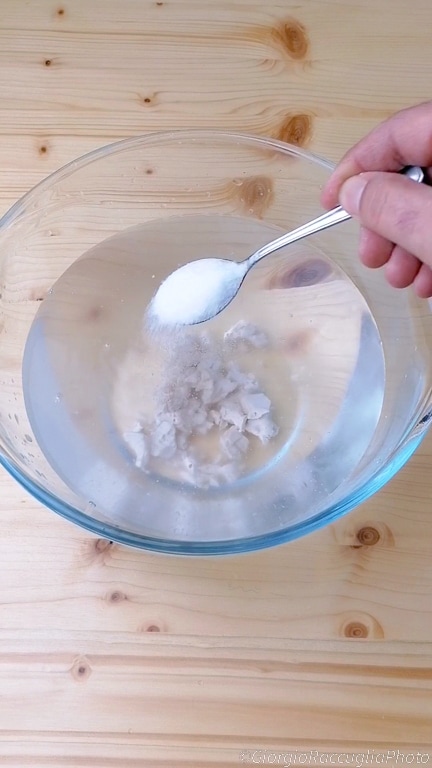 Um das Rezept für gefüllte Zeppole aus Pizzateig zuzubereiten, beginne damit, die Hefe in einer Schüssel mit Wasser aufzulösen,