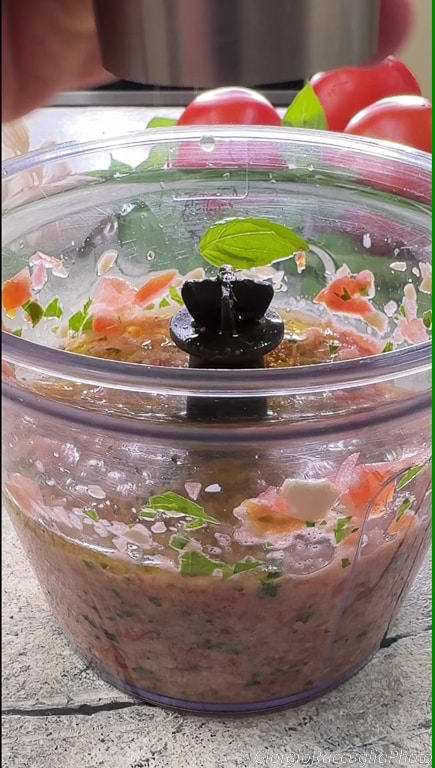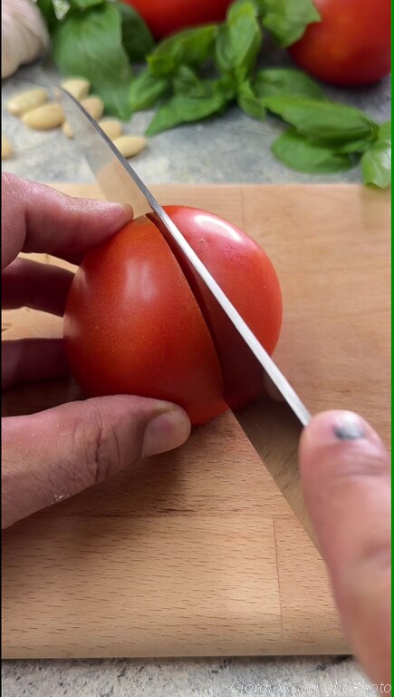 Um die kalte Pasta mit trapanesischem Pesto zuzubereiten, beginne damit, die Pasta in reichlich gesalzenem Wasser zu kochen und bereite in der Zwischenzeit das Pesto zu. Schneide die Tomaten grob.