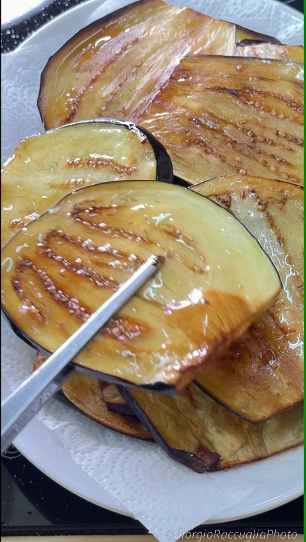Braten Sie die Auberginen von beiden Seiten und wenn sie schön goldbraun sind, lassen Sie sie auf einem mit Küchenpapier ausgelegten Tablett abtropfen.