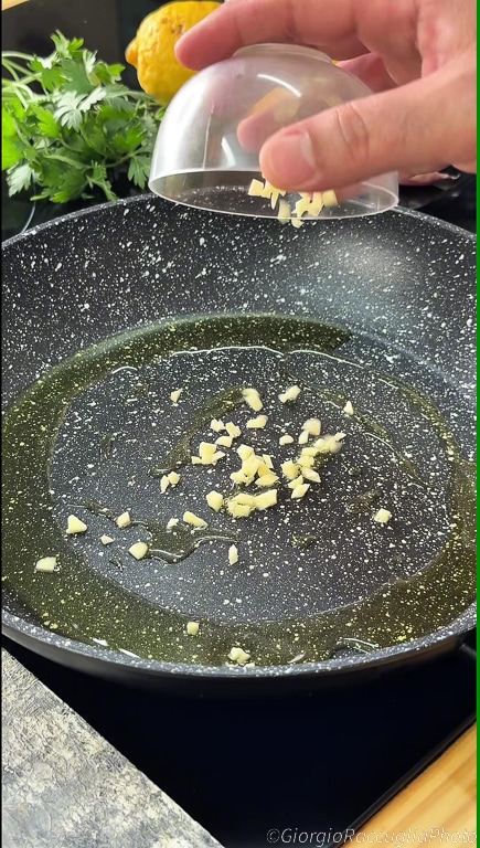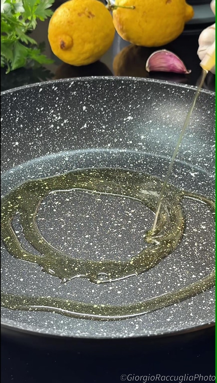 In der Zwischenzeit 4 Esslöffel natives Olivenöl extra in einer großen Pfanne erhitzen.