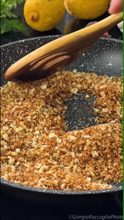 Die Muddica Atturrata zubereiten: Die Muddica Atturrata ist eine wesentliche Zutat in der Pasta alla Carrettiera aus Palermo. In einer Antihaftpfanne einen Schuss natives Olivenöl extra geben und
