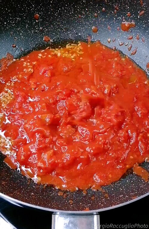 fügen Sie die Tomatenstücke oder geschälte Tomaten hinzu, die Sie mit den Händen zerdrückt haben.