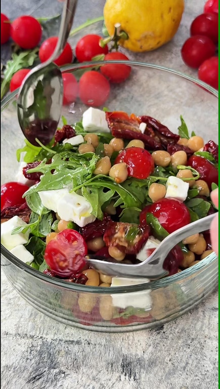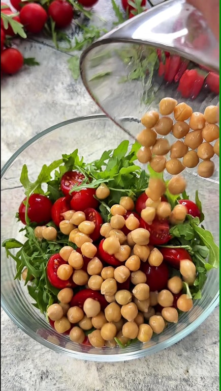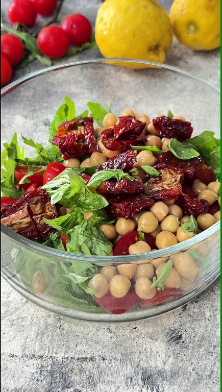 Der sommerliche Salat mit Rucola, Kichererbsen und Feta ist ein frisches, leichtes Rezept, perfekt für schnelle Mittagessen oder Abendessen im Freien während der warmen Monate. Reich an Geschmack dank Kirschtomaten, getrockneten Tomaten und frischem Basilikum, vereint er Geschmack und Wohlbefinden in jedem Bissen. Die Zugabe von Feta verleiht eine cremige und würzige Note, während Zitronensaft und extra natives Olivenöl alle Zutaten mit Einfachheit hervorheben. Dieser kalte Sommersalat ist auch ideal für Vegetarier oder diejenigen, die ein ausgewogenes Hauptgericht suchen, dank der Kichererbsen, die pflanzliches Eiweiß liefern. Er ist in wenigen Minuten zubereitet und kann leicht mit saisonalem Gemüse oder anderen Hülsenfrüchten personalisiert werden. Eine großartige Lösung für alle, die gesund essen möchten, ohne auf Geschmack zu verzichten, perfekt auch für das Büro oder den Strand.