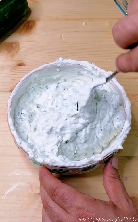 Gießen Sie einen Schuss Öl über die Tzatziki-Sauce und