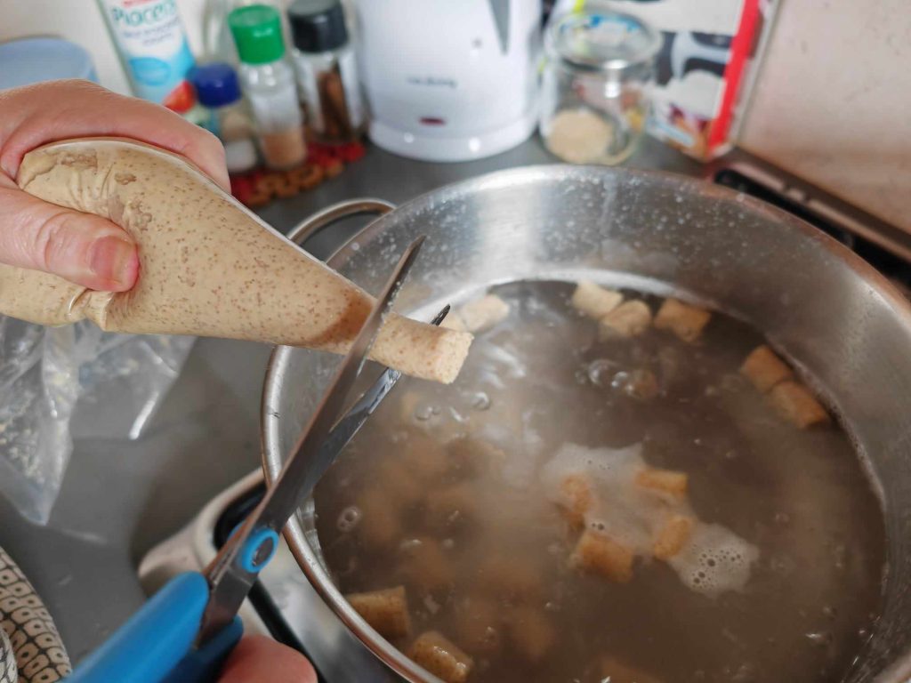 Sobald das Wasser zu kochen beginnt, den Spritzbeutel über den Topf halten und die Füllung so drücken, dass sie direkt ins Wasser gleitet: kleine Gnocchi „Zylinder von etwa zwei cm Länge“ mit Hilfe einer Schere formen.