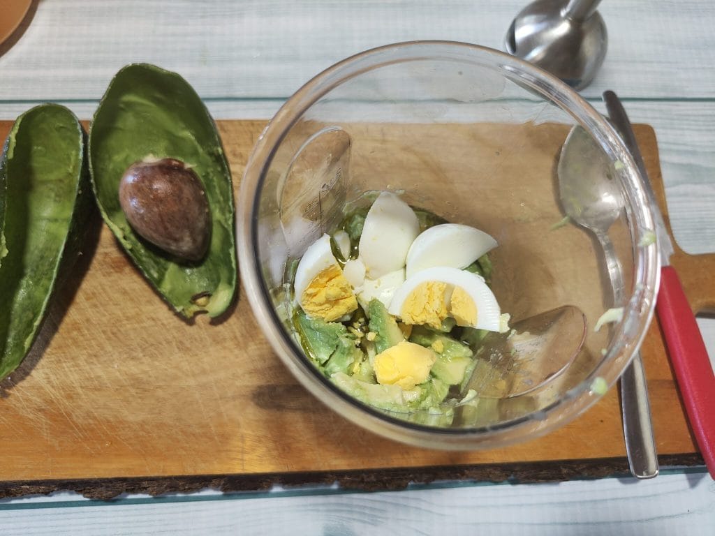 Nach dem Schälen der Avocado das Fruchtfleisch in Stücke geschnitten in das Glas des Stabmixers geben, kaltes hartgekochtes Ei in Stücke geschnitten, den Zitronensaft und das Öl hinzufügen; mit Salz abschmecken und eine Prise Pfeffer hinzufügen.