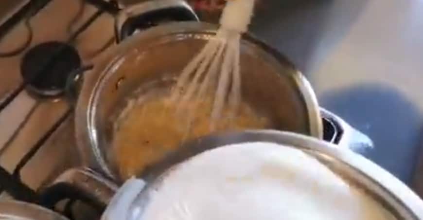 Reduziere die Hitze auf ein Minimum, füge das gesiebte Mehl hinzu und rühre schnell um, bis eine haselnussfarbene Creme entsteht, das sogenannte Roux, also die Basis, die als Bindemittel dient.