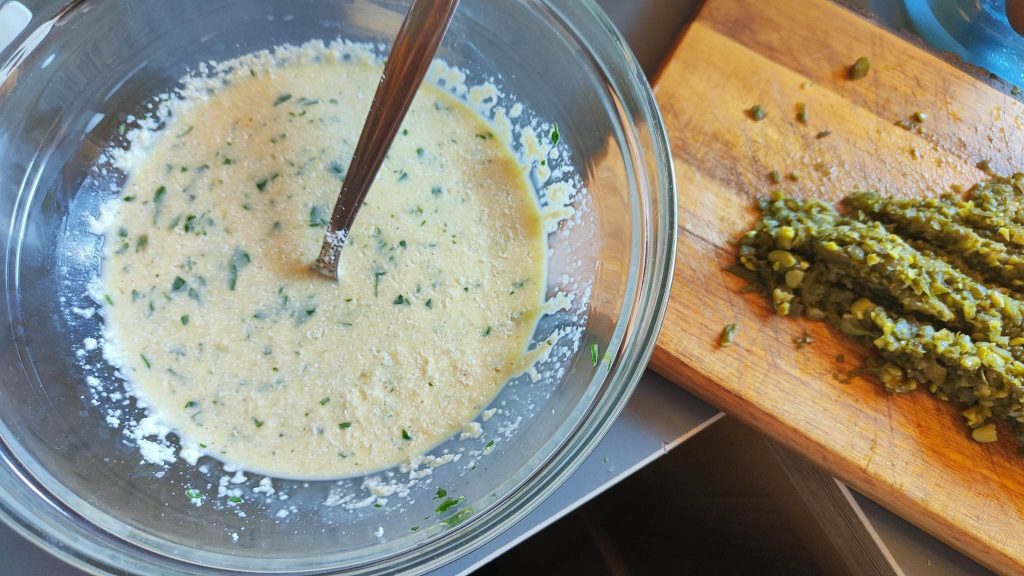 Schlagen Sie die Eier in einer Schüssel auf, mischen Sie sie mit dem Parmesan, würzen Sie mit Salz und einer Prise Muskatnuss, gehackten Kräutern und einer Prise Pfeffer.