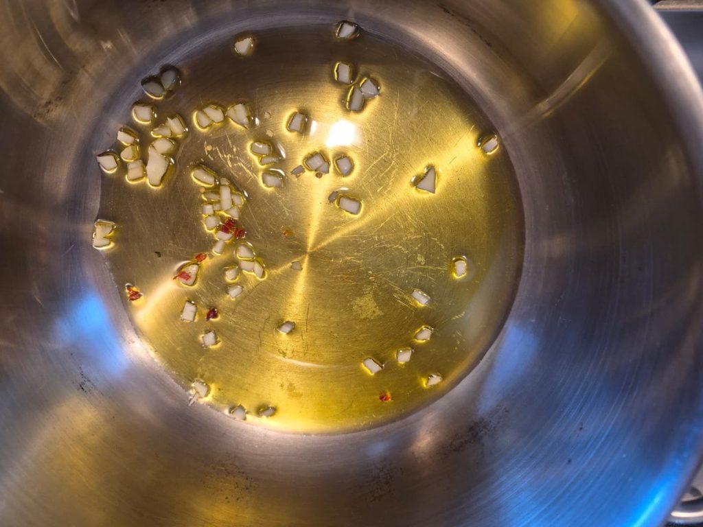 Nach ihren alten Ratschlägen habe ich das gute Öl verwendet, die Käseschale hinzugefügt, die Würze verleiht, und Knoblauch und Chili angebraten, um dem Gericht Charakter zu verleihen.