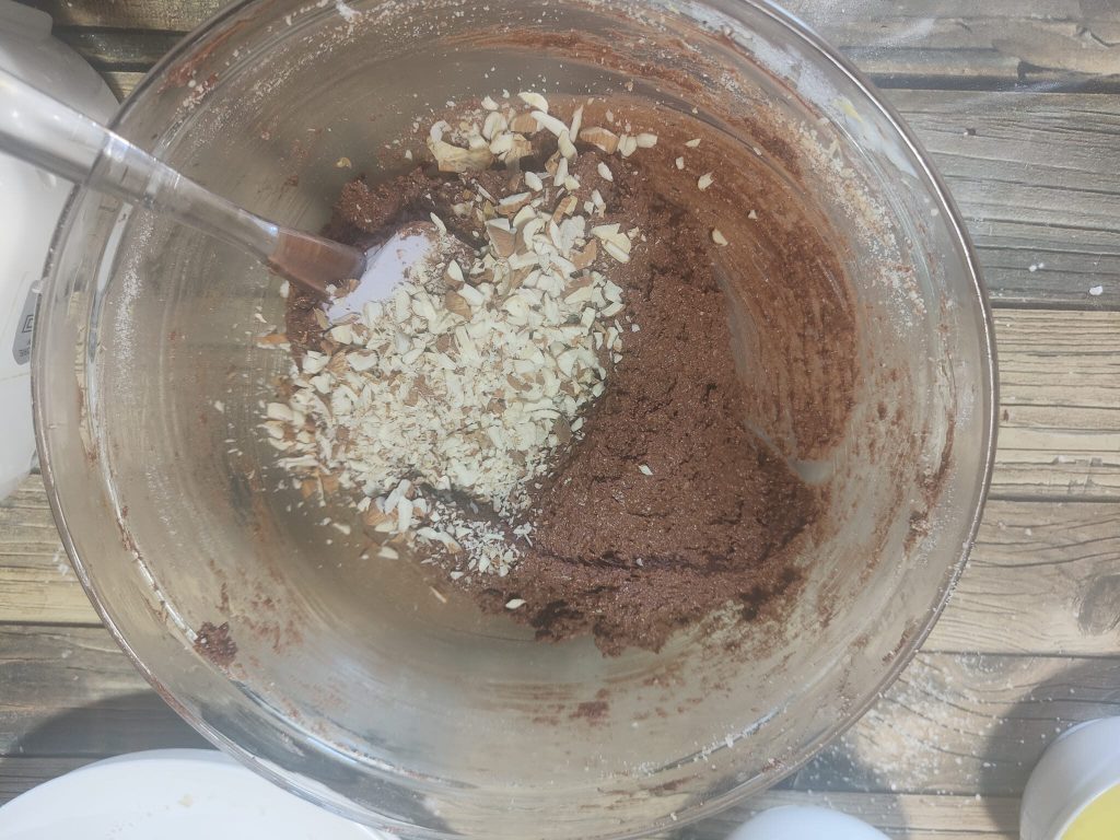 Hacke die Mandeln grob und füge sie der Mischung hinzu, gib auch die Prise Salz dazu und mische.