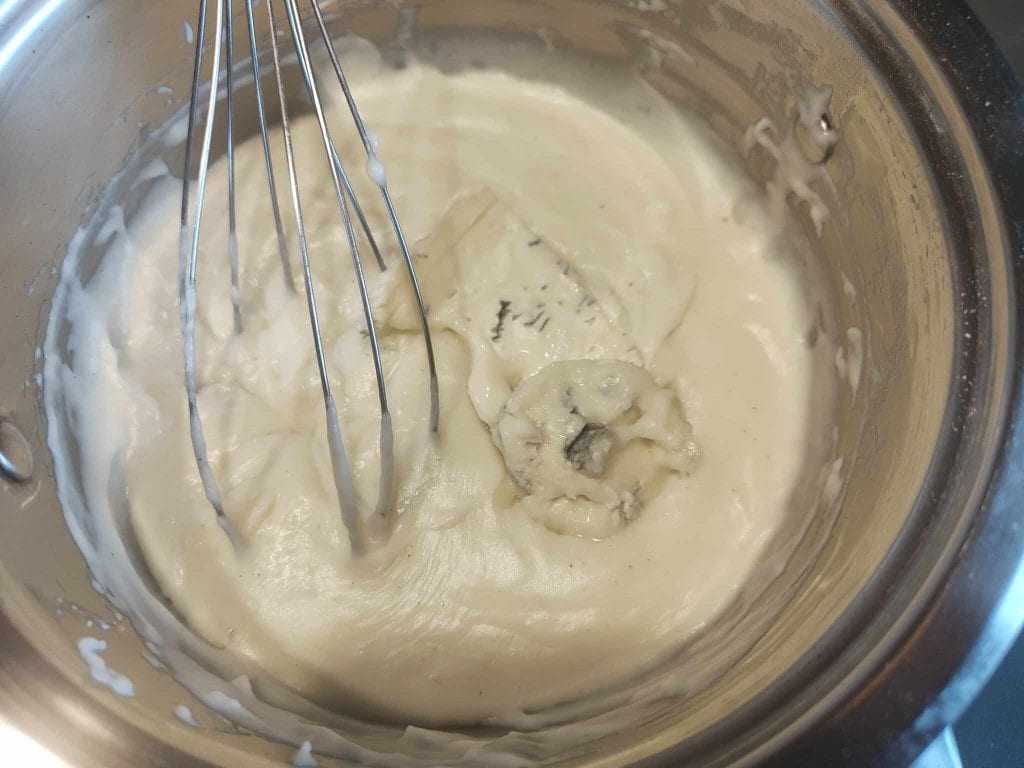 Die Bechamelsauce vom Herd nehmen und den in Stücke geschnittenen Gorgonzola hinzufügen.