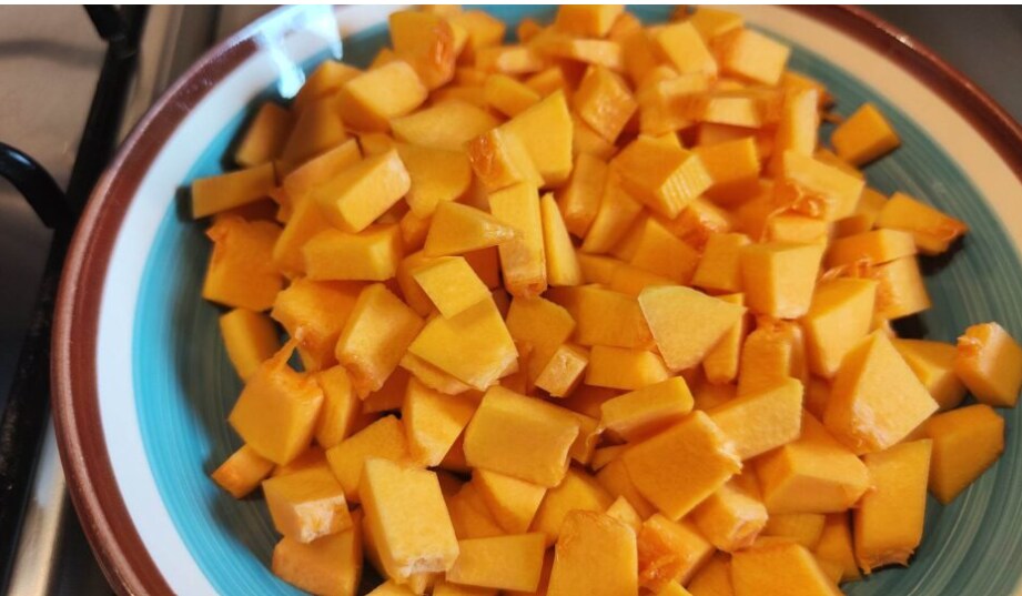 • Schneide das Kürbisfleisch in Würfel, entferne die Schale.