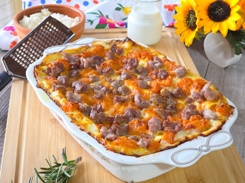Cremige Lasagne mit Kürbis und Wurst, ein zeitloser Klassiker, können sowohl im traditionellen, belüfteten Ofen als auch in der Heißluftfritteuse gebacken werden: Alle drei Methoden sind im Rezept beschrieben.