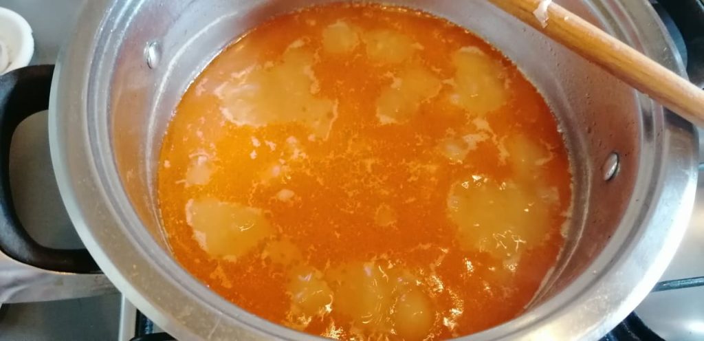 • Die zuvor pürierte Kichererbsencreme hinzufügen, etwas weiteres Kochwasser hinzufügen, zum Kochen bringen und die Pasta hinzufügen. Wichtig: Immer einen Holzlöffel zum Rühren verwenden. Mit Salz abschmecken.