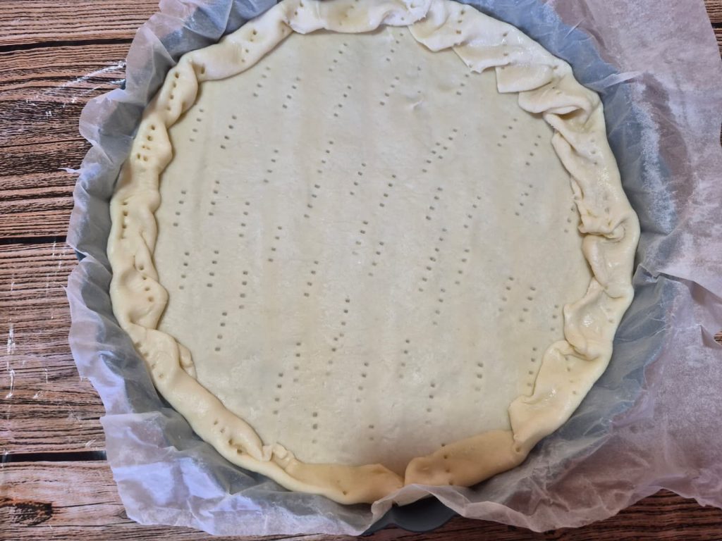 Jetzt den Boden großzügig mit einer Gabel „einstechen“: er sollte voller Löcher sein, damit er nicht aufbläht.