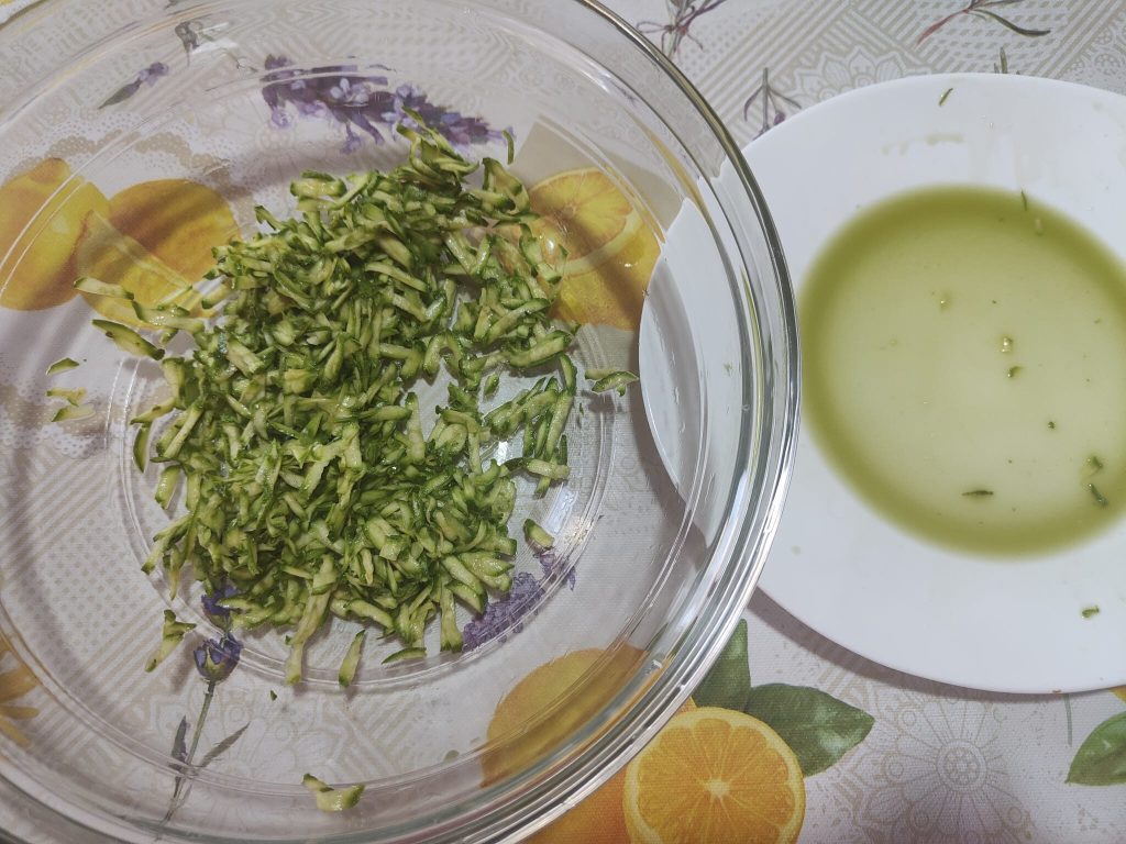 Zucchini raspeln, gut ausdrücken und in eine Schüssel geben.