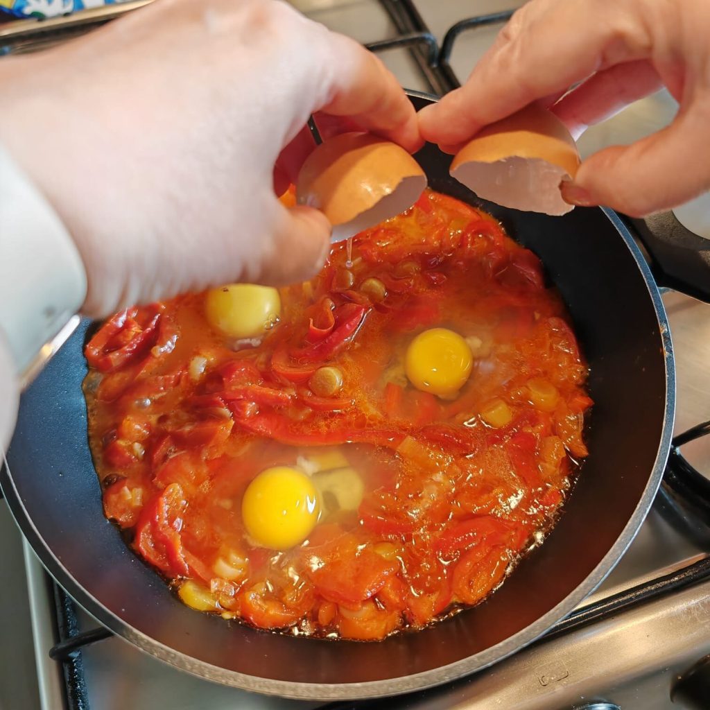 Es handelt sich um ein im Grunde einfaches Gericht: Ein Pfannengericht mit Sauce und die Eier, die gerade aufgeschlagen und einige Minuten gekocht werden, nur so lange, bis das Eiweiß stockt, aber ohne das Eigelb zu lange zu kochen, sonst geht die ganze Magie verloren.
