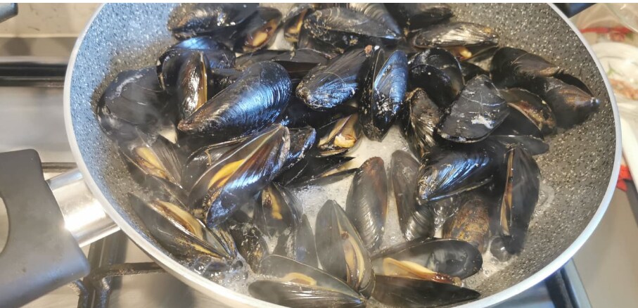 Die Miesmuscheln öffnen lassen und die meisten schälen.