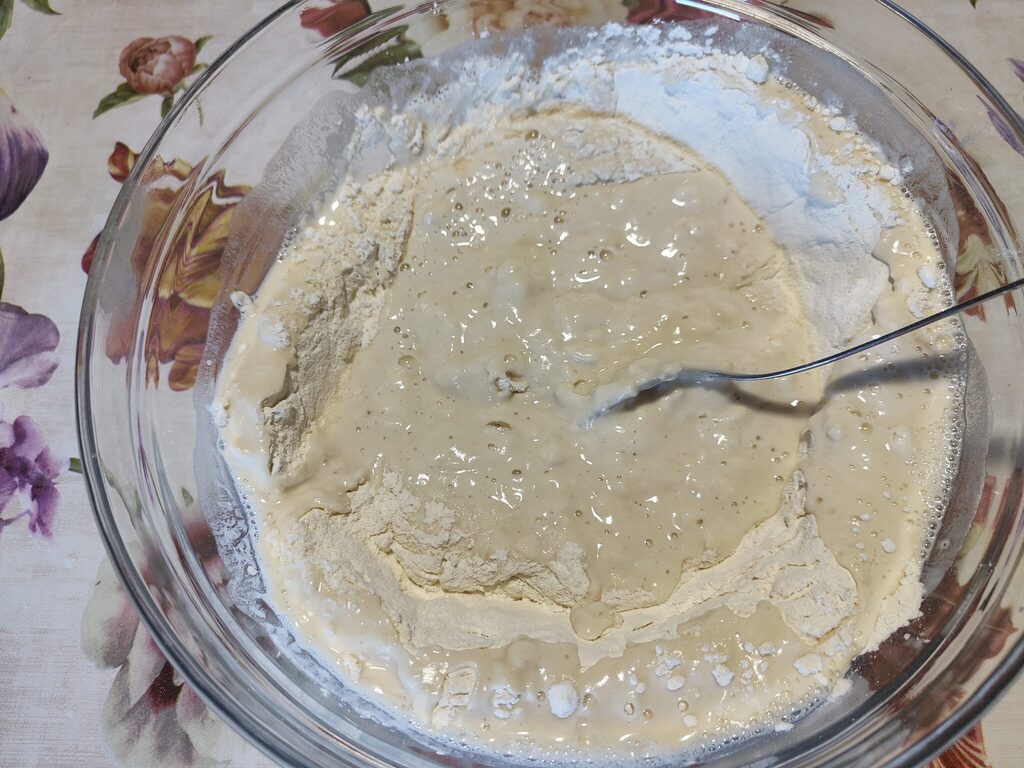 Das Erste, was Sie tun müssen, ist, die beiden Mehlsorten, die Trockenhefe in eine Schüssel zu geben und das Wasser langsam einzugießen.Mischen.